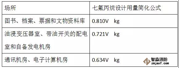 溫馨提示: 在一般情況(指最低溫度為20℃,海拔高度不超過1km)下,公式里的K值取1、S取0.13716即可。 再根據(jù)第二步中推薦的幾個滅火濃度,我們可以把公式進(jìn)一步簡化。只要知道防火區(qū)凈容積V,就可以算出七氟丙烷的設(shè)計用量。 一般情況下,各場所的七氟丙烷設(shè)計用量粗算公式(單位:kg)